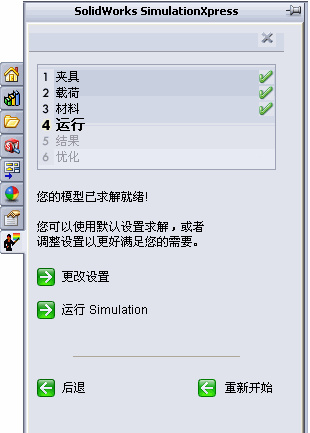 单击 SimulationXpress 分析向导或之后,按照提示操作。向导中交互了诸如 Simulation 算例树和 PropertyManagers 等 Simulation 界面组件,来引导您执行模拟工作流程。