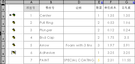 您可在表格行中输入自定义数据。例如,您可为不属于装配体的某项(如材料明细表中的油漆)定义一个行。