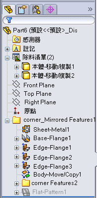- 在 FeatureManager(特徵管理員)中,展開 corner_Mirrored Features1 來檢視鏡射本體(零件中的原始本體)的特徵。