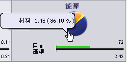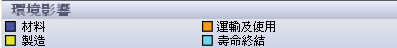 圓形圖的色彩代表了用來測量環境影響的參數。圓形圖的各部份代表個參數對整個環境影響百分比比重。