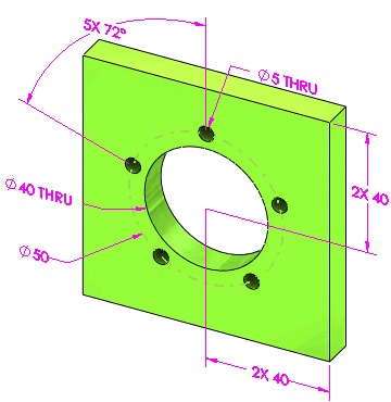para aplicar esquemas de acotación con cotas polares positivas y negativas. Utilice el esquema de acotación polar para aplicar matrices de DimXpert con operaciones axiales a fin de definir el círculo de un perno. En el PropertyManager Esquema de acotación automática, establezca el Número mínimo de taladros para reconocer como una matriz.