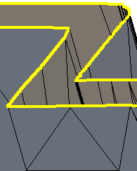 若想生成边界边线,网格边线在任何位置必须只有一个三角形接触边线。例如,沿黄色边线的三角形为接触网格边线的唯一三角形,所以黄色边线为边界边线。