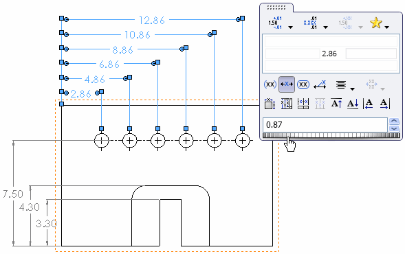 要调整工程图顶部尺寸中的水平间距: