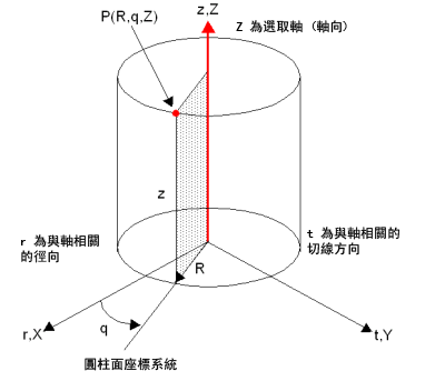 參考軸係定義圓柱座標系統,如下圖所示。在指定徑向及切線拘束時,參考軸是好用且必需的工具。