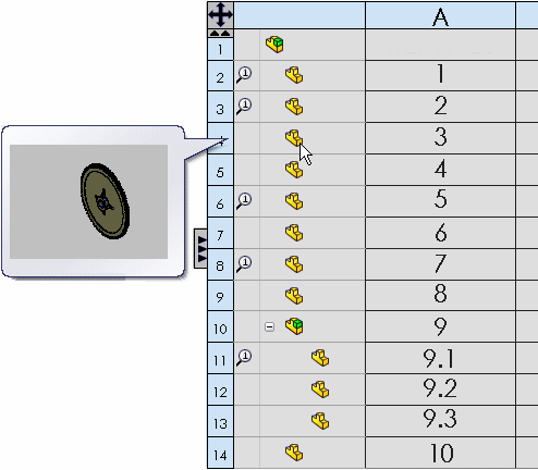 當您將滑鼠指標停留在組合件結構欄中品項的圖示上時,可以預覽 BOM 中每個品項的縮圖。如果您將滑鼠指標停留在某個零組件的圖示上時,其預覽沒有出現,請開啟並儲存該零組件,然後再次將指標停留在圖示上。