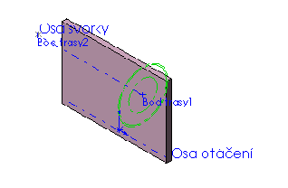 Osu představující cestu trasy vedoucí přes svorku. To je osa trasy pro předem umístěné svorky v sestavě tak, aby jste je mohli vybrat při použití Automatického trasování. Pokud tuto osu pojmenujete Osa svorky, můžete ji použít pro zarovnání svorky s hranou nebo osou v sestavě.