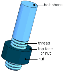 The bolt head and the clamped members are not modeled. To apply 2D simplification, the threads are modeled as separate rings of material and not as a continuous helix (this is a simplification, as helical threads are not axisymmetric). To model the tightening of the joint or sliding of the bolt, you still need to use a 3D model.