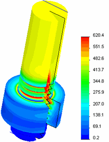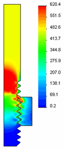 The result shows plastic deformation on the model. Among the contacting threads, the first engaged thread shows a high stress value. The values are lower for the subsequent threads.