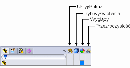 Dla komponentów podzespołu, ustawienia wyświetlania są przechowywane w stanie wyświetlania podzespołu. Spłowiałe ikony wskazują ustawienia wyświetlania zastosowane w dokumencie podzespołu lub części. Jeżeli dane ustawienie podzespołu zostanie zastąpione w złożeniu, ikony zmienią intensywność koloru na normalną (nie wygaszone).