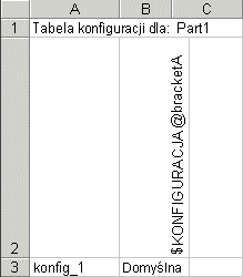 W komórkach głównej części tabeli należy wprowadzić nazwy konfiguracji części bazy. Aby na przykład użyć domyślnej konfiguracji części bazy o nazwie podkładka.sldprt, składnia nagłówka kolumny powinna być następująca: $KONFIGURACJA@podkładka. Wartość komórki tabeli jest Domyślna.