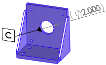 Symbol bazy pomiarowej przyłączony do powierzchni modelu, wymiarów oraz ramki symbolu tolerancji położenia i kształtu |