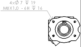 Jeżeli dołączymy objaśnienie otworu do otworu gwintowanego w standardzie calowym ANSI a obecne jednostki rysunku to milimetry, średnica wiertła i głębokość otworu będą podawane w mm ale opis gwintu pozostanie w calach w ANSI. Można zastąpić opis gwintu opisem innych zmiennych z okna dialogowego Zmienne objaśnień otworów.