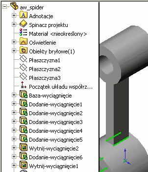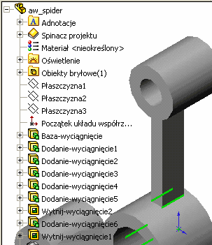 Dynamiczne podświetlanie. Geometria w obszarze graficznym (krawędzie, ściany, płaszczyzny, osie itp.) jest podświetlana gdy wskaźnik przemieszcza się ponad danym elementem w drzewie operacji FeatureManager.