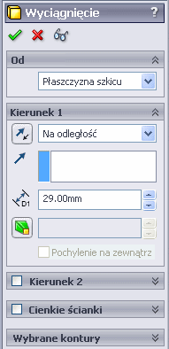 w panelu po lewej stronie obszaru graficznego. Zostaje on otwarty przy wybraniu elementów lub poleceń zdefiniowanych w menedżerze właściwości PropertyManager. Można ustawić czy otwiera się on w innych przypadkach w Narzędzia, Opcje, Opcje systemu, Ogólne.