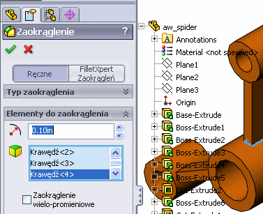Pola wyboru. Możemy akceptować wybory w obszarze graficznym lub w drzewie operacji FeatureManager. Kiedy pola są aktywne mają one kolor różowy. Kiedy wybierzemy element w polu wyboru, jest on podświetlony w obszarze graficznym. Aby usunąć wybory z pola, należy kliknąć prawym przyciskiem myszy i wybrać Usuń (dla jednego elementu) lub Wyczyść wybór (dla wszystkich elementów).