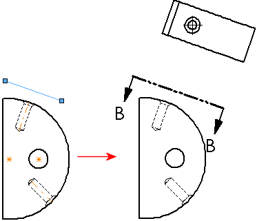 Można użyć naszkicowanych linii dla składania. W tym przykładzie, aby prawidłowo zorientować widok pomocniczy, należy dodać relację prostopadłości pomiędzy naszkicowaną linią a tymczasową osią otworu.