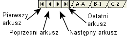 W rysunkach zawierających wiele arkuszy, które wykraczają poza szerokość ekranu, należy użyć przycisków nawigacyjnych w dolnej części okna rysunku, aby przejść do kart pierwszego lub ostatniego arkusza.