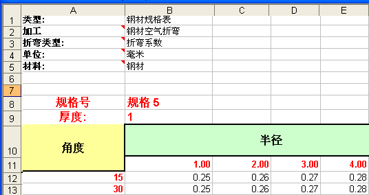 其中包含规格/折弯系数表和规格表。您可以用它们作为模板来生成自己的表。