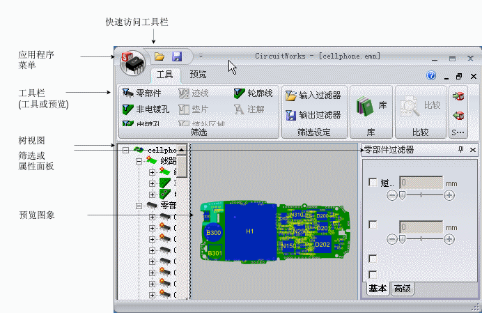 从 SolidWorks 打开 ECAD 文件时,会出现 CircuitWorks 窗口。使用该界面可打开、比较和保存 ECAD 文件;滤除一些特征以降低复杂性;修改 ECAD 属性;构建 SolidWorks 零件和装配体模型。