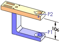 為量測開始處和量測結束處選擇指定確切點時,可以選擇兩個搪孔的弧圓心 P1 和 P2 點。