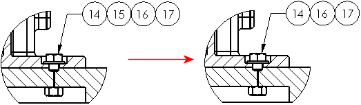 Os balões empilhados combinam vários balões com uma só linha de chamada. Os balões são empilhados a cada vez que você seleciona um componente. Você pode empilhar os balões horizontal ou verticalmente. É possível inserir balões empilhados nos desenhos de montagens e nos documentos de montagem.