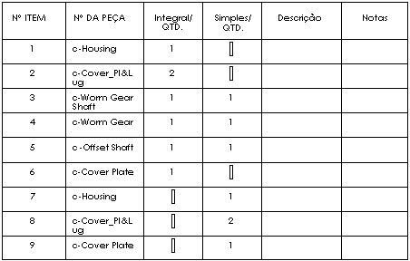 Tabela geral Lista de materiais Tabela de furos Tabela de revisão Lista de corte de soldagem Tabela de soldagem Tabela Bloco de Título |