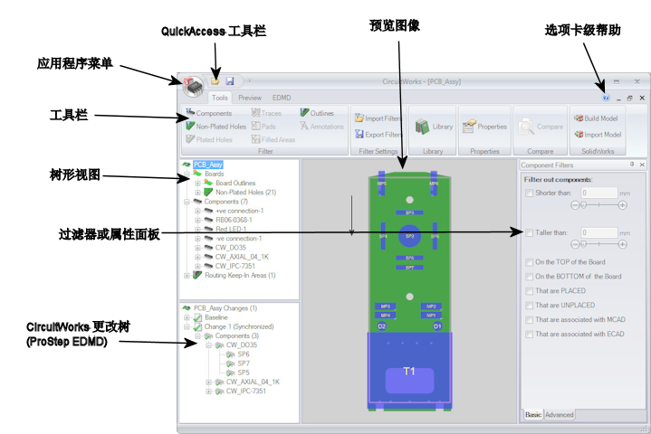 从 SolidWorks 打开 ECAD 文件时,会出现 CircuitWorks 窗口。使用该界面可打开、比较和保存 ECAD 文件;滤除一些特征以降低复杂性;修改 ECAD 属性;构建 SolidWorks 零件和装配体模型。