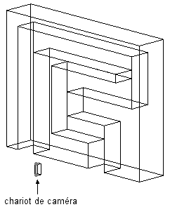 Dans cette animation, l'assemblage est éclaté et la trajectoire du chariot de caméra suit les axes X, Y et Z.