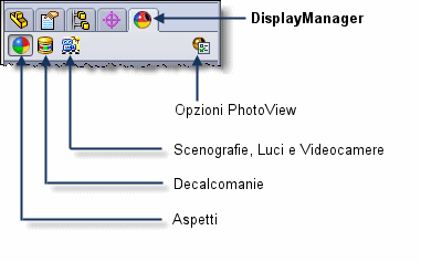 Il DisplayManager elenca gli aspetti, le decalcomanie, le luci, scenogragie e videocamere applicate al modello corrente. Dal DisplayManager, sarà possibile vedere il contenuto applicato ed aggiungere, modificare o cancellare gli elementi. Quando PhotoView 360 viene aggiunto, il DisplayManager fornisce l'accesso alle opzioni PhotoView.