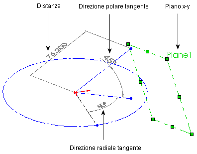 Direzione radiale tangente. Controlla l'angolo tra la proiezione della perpendicolare sul piano x-y e la direzione X.