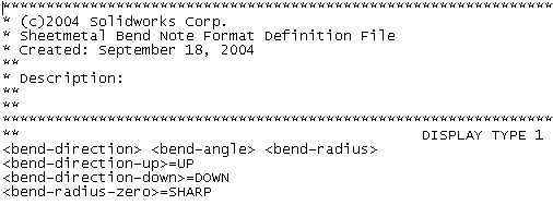 Le note della linea di piegatura della lamiera consistono in un file di testo in <install>\lang\<italian>\bendnoteformat.txt. Questo file imposta il formato delle note di linea di piegatura.