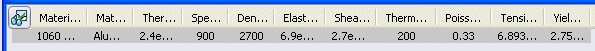 Exibir somente os selecionados Filtra a lista de materiais semelhantes para exibir somente aqueles que você selecionar . Essa lista contém as propriedades dos materiais e seus valores, por exemplo, coeficiente de expansão térmica, calor específico, densidade, etc. O material Original é exibido na linha superior, acima da lista de materiais semelhantes.