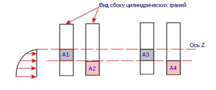 Нагрузка на опору прикладывается на выбранные цилиндрические грани, как схематически показано на рисунке. Обратите внимание на то, что нагрузка на опору применена по нормали к грани, и что Вы также можете выбрать круговые кромки оболочки. Предположим, что выбранная площадь A1=A2, а A3=A4. A2 получит больше силы, потому что имеет максимально напряженное местоположение в полупространстве. Подобным образом, A4 получит больше силы, чем A3. Соотношение сил, полученных A1 и A3, прямо пропорционально их площадям, поскольку они занимают одинаковые относительные положения в полупространстве. То же самое можно сказать и для A2 и A4.