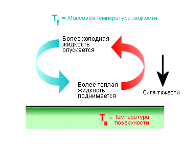 Движение жидкости или газа, примыкающих к поверхности твердого тела, вызывается силами выталкивания, на которые оказывает влияние изменение в плотности жидкости или газа благодаря разнице температур между твердым телом и жидкостью или газом. Когда горячая пластина оставлена остывать на воздухе, частички воздуха, соприкасающиеся с поверхностью пластины, нагреваются, их плотность уменьшается и потому они движутся вверх.