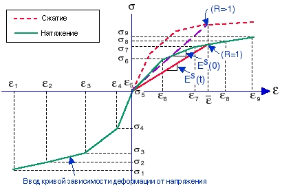 Было установлено следующее: R = 1 представляет случай неосевого растяжения, а R = -1 относится к случаю сжатия. Данные два случая установлены к верхнему и нижнему пределу, с обеспечением возврата программой значения R к установленному параметру, в случае превышения данных двух пределов. Нелинейная упругая модель материала может использоваться с твердотельными и сетками оболочек.