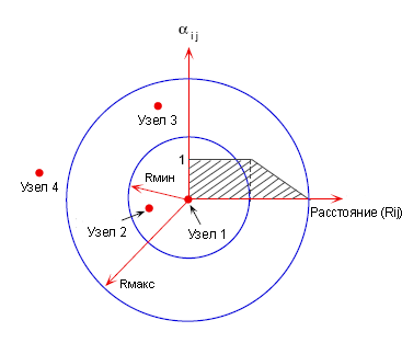 Частичная корреляция основана на пространственном расстоянии RIj между двумя узлами. В зависимости от отношения между определяемыми пользователем параметрами RМИН., RМАКС. и Rij: