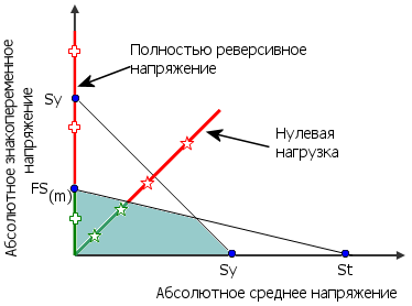 Синяя и красная области эпюры проверки усталости определяются из приведенной ниже диаграммы. Для каждого узла программа вычисляет знакопеременное и среднее напряжения на основе определенного типа события усталости.
