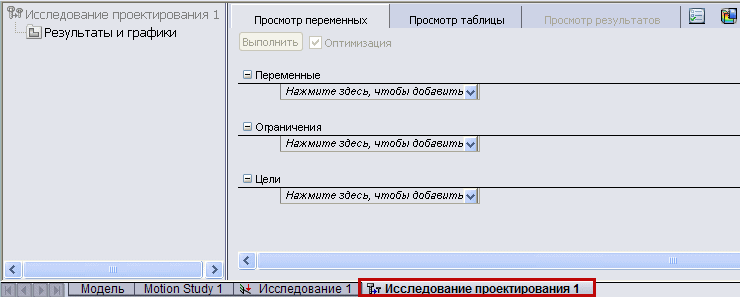 (панель инструментов «Инструменты») или выберите . В нижней части графической области появится вкладка Исследование проектирования.