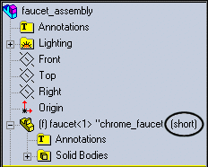 En la parte superior del gestor de diseño del FeatureManager, haga clic con el botón secundario del ratón en el nombre de la pieza, ensamblaje o dibujo y seleccione Visualización de gestor, Visualizar nombres de configuraciones de componente.