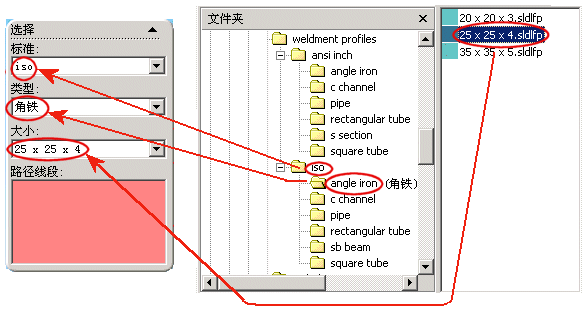 焊件轮廓的默认位置为<安装目录>\data\weldment profiles。weldment profiles (焊件轮廓)文件夹中的子文件夹结构决定出现在结构构件 PropertyManager 中的选择。PropertyManager 中的选择框及相应的 Windows 资源管理器文件夹和文件结构设定如下: