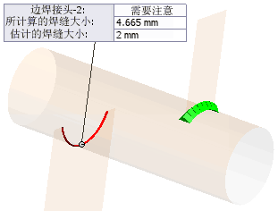 PropertyManager 中说明)小于程序计算所得焊缝大小的所有焊缝接头。这些接头在图形区域中显示为红色。