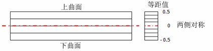 - 按照等距值定义的部分确定层叠的位置,该等距值为从中曲面到参考曲面所测量的总厚度的一小部分。下图所示为正、负等距值。