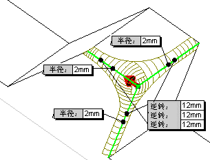 逆转圆角以完全预览显示,三条边线应用了不同的逆转距离