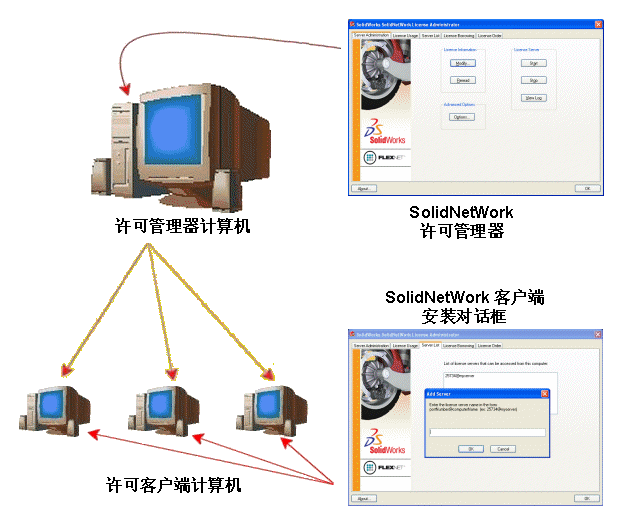 SolidNetWork 许可管理器可通过向网络中的客户端分发许可,支持多个许可客户端。这样就能够利用浮动许可,允许用户数量超过许可数量。
