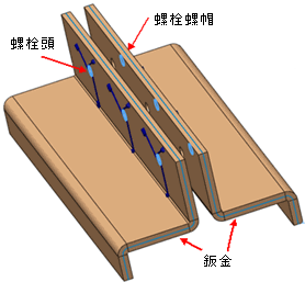 可以連接兩個零組件、多個零組件,或是將零組件與地面連接。您可以藉由混合堆疊實體、薄殼及鈑金體來定義螺栓。您也可以選擇相同零組件的圖元來定義螺栓。