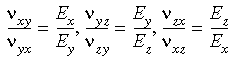 請注意,為滿足彈性模數矩陣的對稱性,必須 nxyEy = nyx Ex。