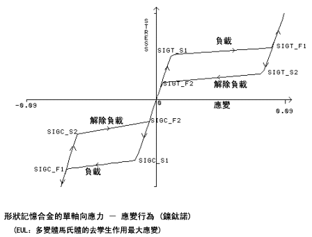 鎳鈦諾條棒在單軸負載條件下所產生的典型應力-應變反應。需注意的是,材料在張力及壓縮方面呈現出不同行為。