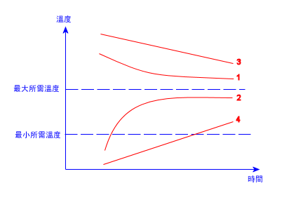 如果恆溫器位置的溫度趨近於溫度界限的一端,在圖上呈一斜線但未超出界限 (如曲線 3 和 4),請增加求解時間,然後重新執行此專題。