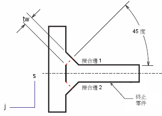 熔接牽引如所示變成熔接喉部的座標。熔接喉部的區域是集中於根部的。