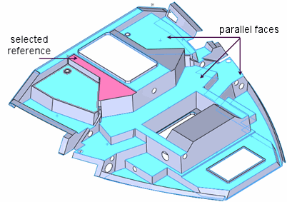 您也可以使用參考面或邊線來定義投影的方向。例如,在船槽模型中,您可以使用平行薄殼面之一來做為所選參考以投影 0º 參考到其他面上。